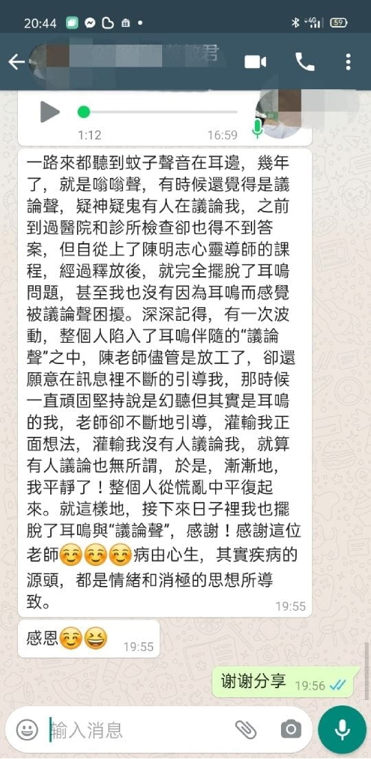 在过去我的引导耳鸣的学生的病因都不一样,但这些学生都是经过医生的治疗无法疗愈,才来找我,所以我这一站总是资源回收,但总算我还是称职的回收商,哈哈!